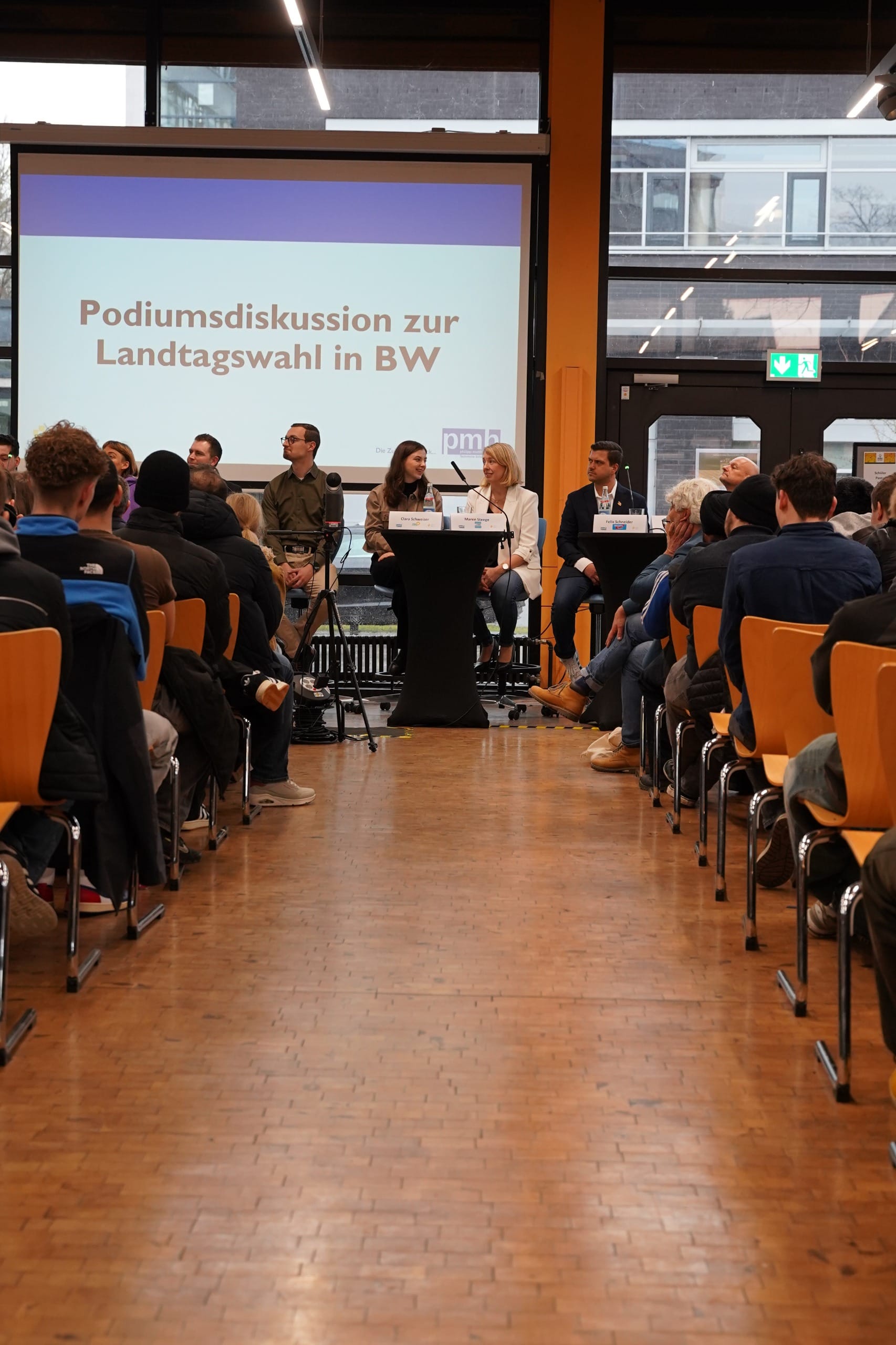 Die Schule hat mit verschiedenen Beteiligten eine beeindruckend professionelle Podiumsdiskussion auf die Beine gestellt. In der Mensa fanden sich einzelne Klassen der verschiedenen Schularten ein. Alle anderen 50 Klassen waren per Livestream dazu geschaltet und konnten ihre Fragen per Chat an die Kandidierenden richten. Ein Fakten-Check wurde ebenso nach jeder Fragerunde vorgenommen.